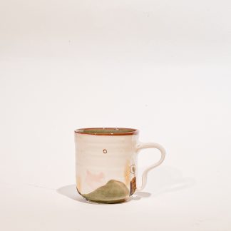 Handdrejad mugg i lergods. Dekorerad med uppslammad och infärgad lera (engobe). Rymmer ca 3 dl. Kan maskindiskas.