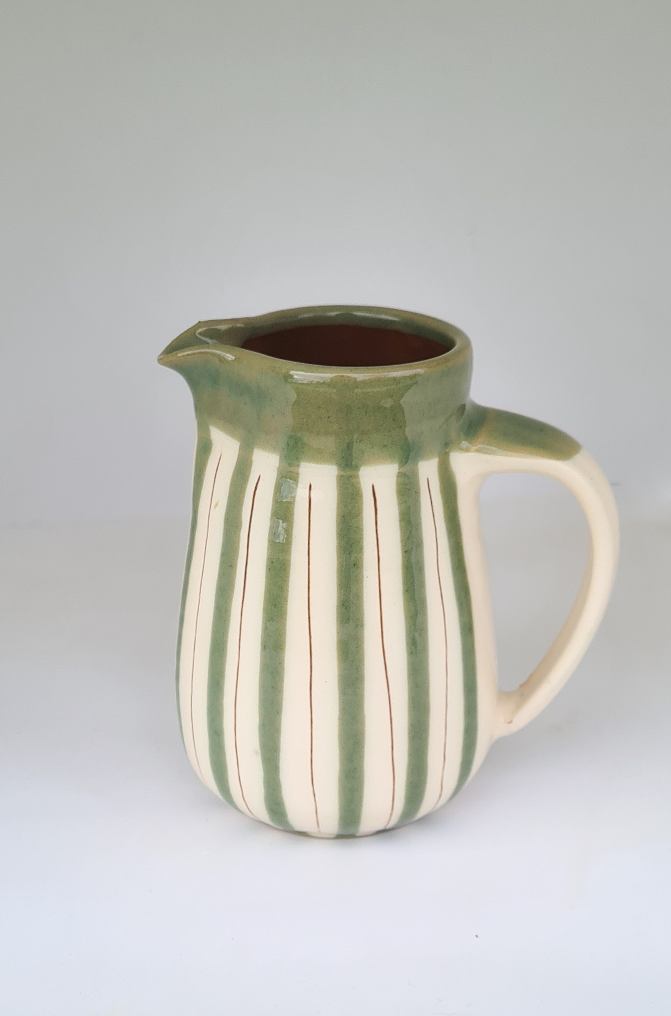 Handdrejad kanna som rymmer ca 4 dl. Dekorerad med vit och grön engobe (lera). OBS! Ny grön färg på randen, lite mörkare än den tidigare.