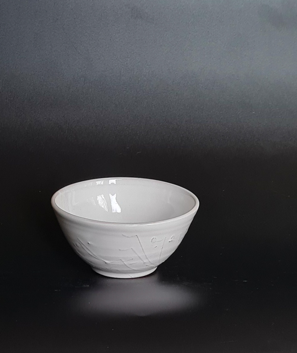Handdrejad skål med reliefdekor. Vit glasyr. Rymmer 2 dl. Kan maskindiskas.